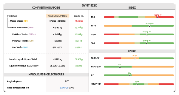 Cette tuile résume la composition corporelle en décomposant le poids (masse grasse, masse maigre, protéines, minéraux, eau) et en intégrant des index clés (FMI, FFMI, ASMI, etc.) pour évaluer l’état nutritionnel et détecter des déséquilibres de la composition corporelle.